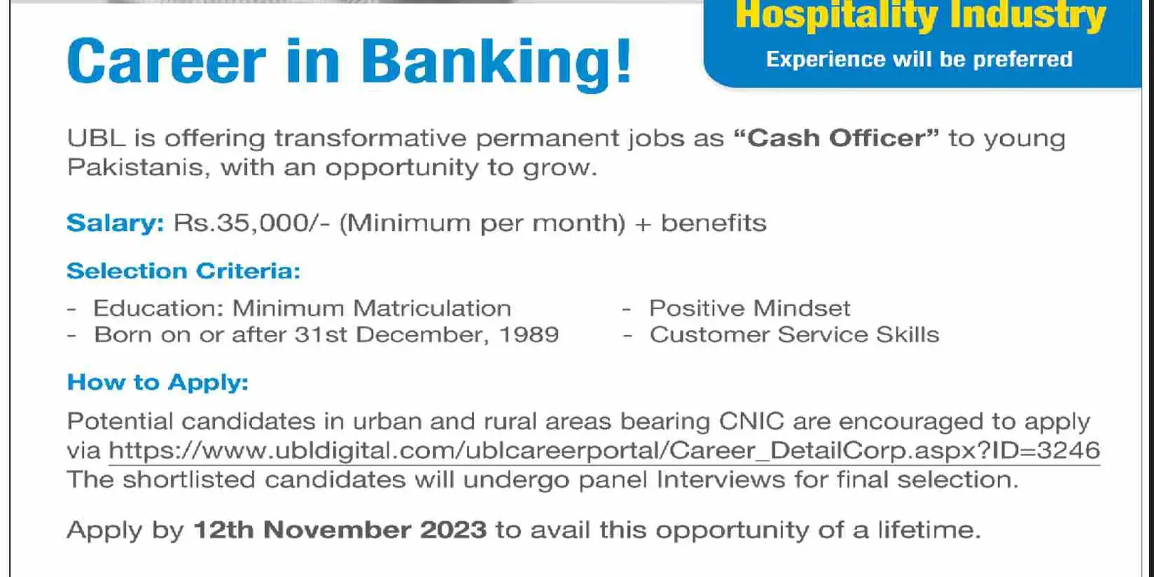 UBL Jobs for Matric Pass Candidates as Cash Officers | Application Process