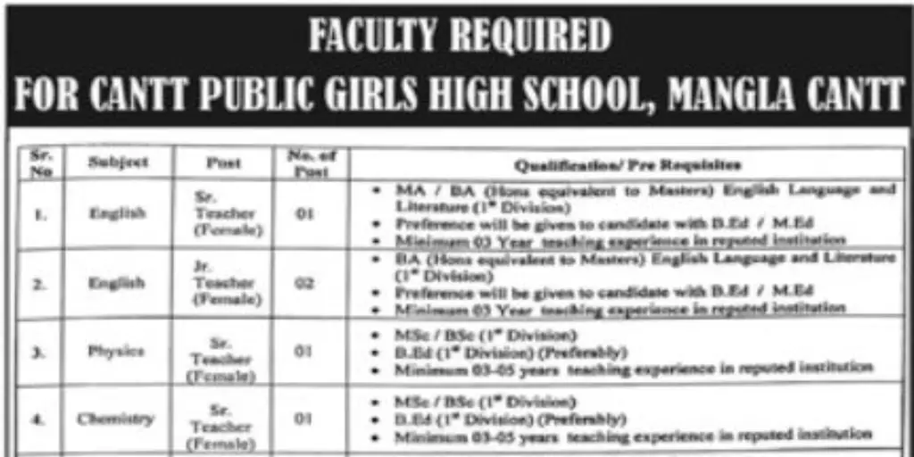 Cantt Public Girls High School Mangala Cantt Job Vacancies for Female Senior and Junior Teachers