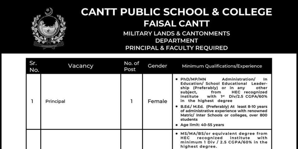 Cantt Public School Faisal Karachi Female Teachers Jobs 2024 are announced through the Advertisement published in Newspapers and applications are invited from the Eligible candidates for the multiple Vacant Positions. Cantt Public School and College Faisal Can’t (Military Land and Cantonment Department) seeking applications for Principal and Teaching Faculty. Desirous candidates may submit applications through the … Read more