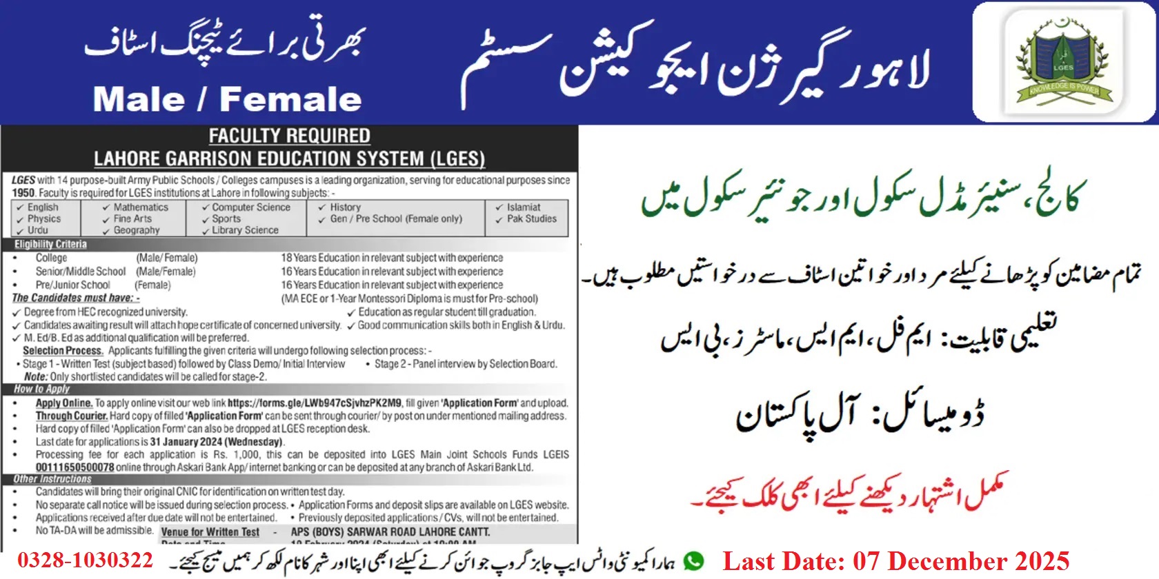 Lahore Garrison Education System Jobs 2025 for Teaching Staff All Subjects
