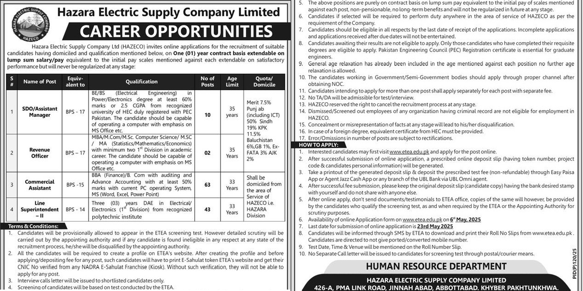 WAPDA HAZECO Jobs 2026 in Hazara Electric Supply Company were announced through an advertisement published in Newspapers. HAZECO Jobs 2026 are open now, and aspirants can submit online applications through ETEA. Both Males and Females across Pakistan can submit online applications. HAZECO Hazara Electric Supply Company Jobs 2026 for vacant Positions including SDO / Assistant … Read more