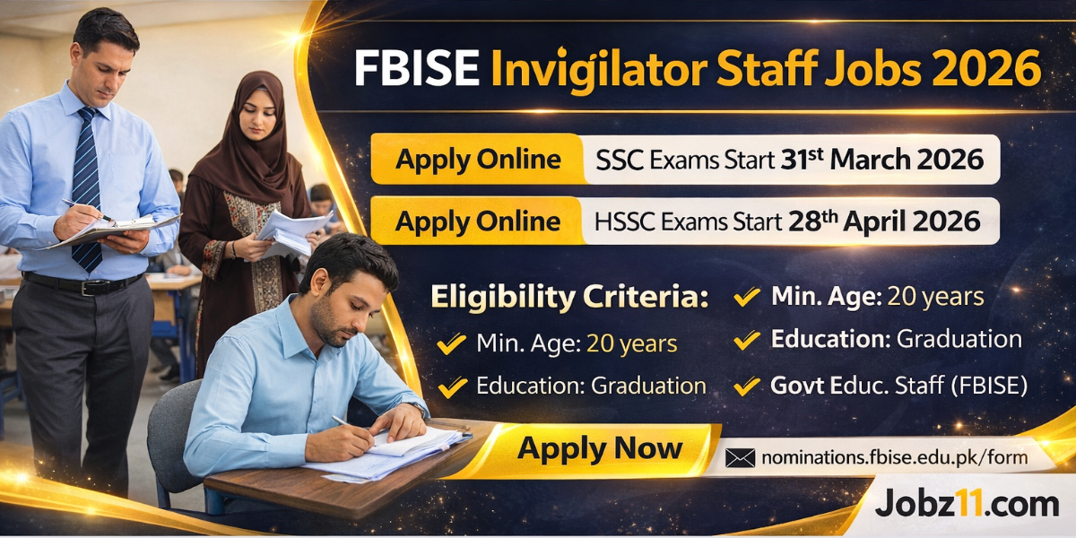 FBISE Invigilator Staff Jobs 2026 have been officially announced by the Federal Board of Intermediate and Secondary Education (FBISE) for the upcoming SSC and HSSC Annual Examinations 2026. FBISE is inviting applications from eligible and qualified individuals to serve as Invigilators during the exams starting in March and April 2026. This is an excellent opportunity … Read more