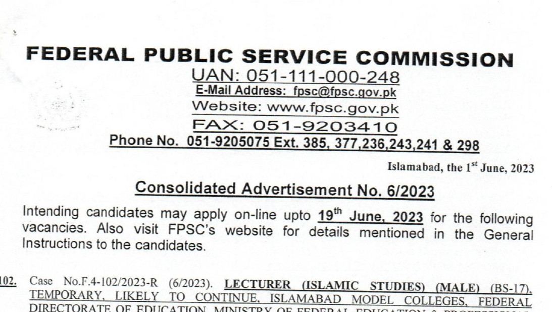 FPSC Jobs Advertisement 06/2023 Last Date to Apply Online is 19 June 2023.