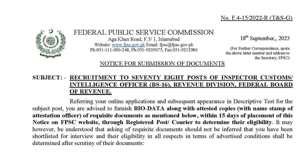 Referring your online applications and subsequent appearance in Descriptive Test for Inspector Customs / Intelligence Officers you are advised to furnish BIO-DATA along with attested copies (with name stamp of attestation officer) of requisite documents as mentioned below, within 15 days of placement of this Notice on FPSC website, through Registered Post/ Courier to determine their eligibility. It may however, be understood that asking of requisite documents should not be inferred that you have been shortlisted for interview and their eligibility in all respects in terms of advertised conditions shall be determined after scrutiny of their documents: