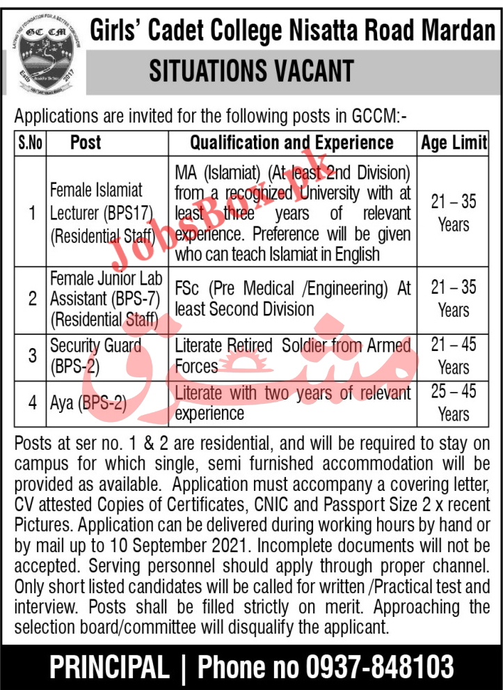 Girls Cadet College Mardan GCCM is seeking to hire a Female condidates for the following postion, Islamiyat Lecturer (BPS-17), Female Junior Lab Assistant (BPS-07), Security Guard (BPS-02), and Aya (BPS-02). Candidates having MA in Islamiyat may apply for Lecturers Jobs. FSc Pre Medical/Engineering qualified may apply for Junior Lab Assistant post. Literate candidates can apply for other vacancy.