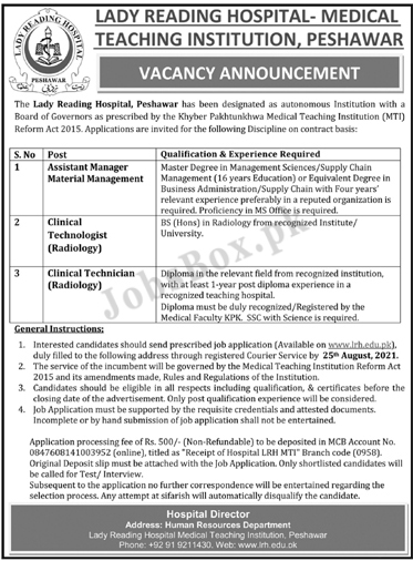 Lady Reading Hospital LRH Peshawar latest Jobs details descrption: