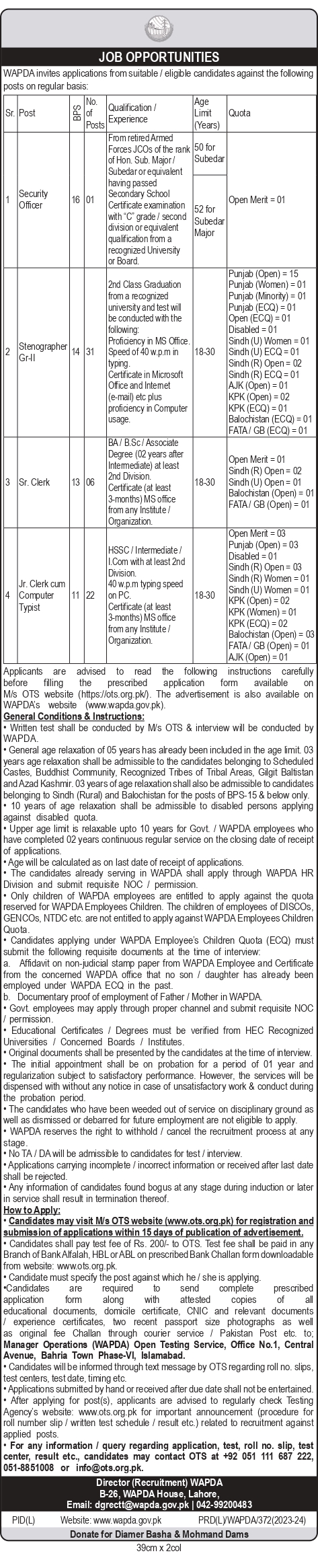The rate of fee for various posts is: BS-16 to 17 is Rs. 300/- ; BS-18= Rs. 750/- ; BS-19= Rs. 1200/- BS-20 and above=Rs. 1500/-. The fee may be deposited on or before the closing date in the nearest Government Treasury or in a branch of the National Bank of Pakistan. Original T.R. may be preserved and provided to the supervisory staff at the time of the Test / Examination at the Center given in the Admission Certificate. A photocopy of the Bank Scroll is not acceptable. Without original Treasury Receipt candidates would not be allowed entry in the examination Center.