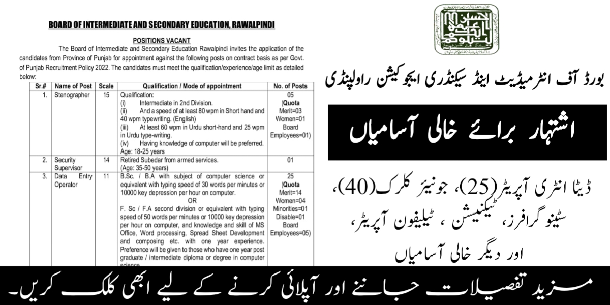 BISE Rawalpindi Latest Jobs July 2024 Career Opportunities