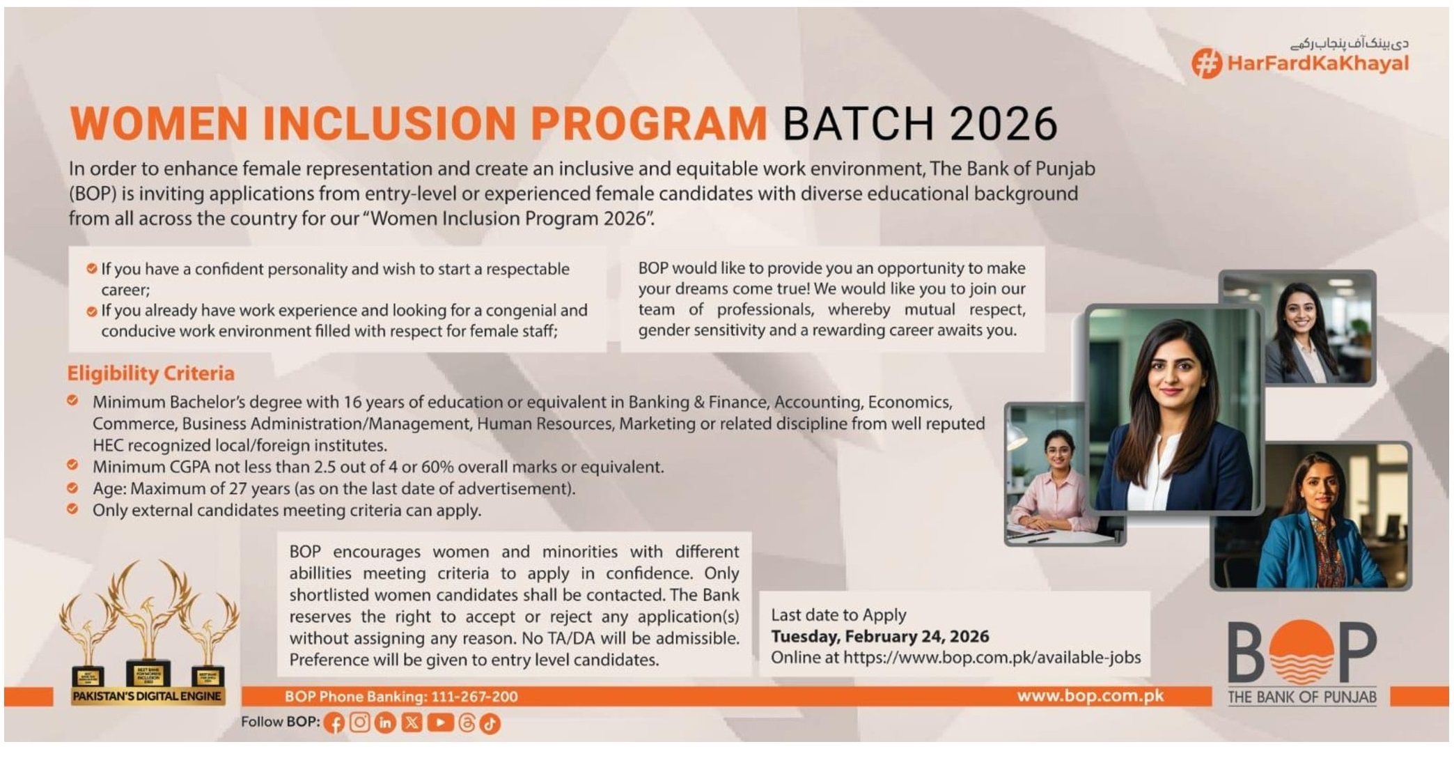 The Bank of Punjab has recently announced the Women Inclusion Program 2026 specially for the Females of Pakistan. In order to enhance Female representation and create an inclusion and equitable work environment, The Bank of Punjab (BOP) is inviting applications exclusive from Entry Level or experienced Female Candidates with diverse Educational Background from all across the Country for Women Inclusion Program 2026.
