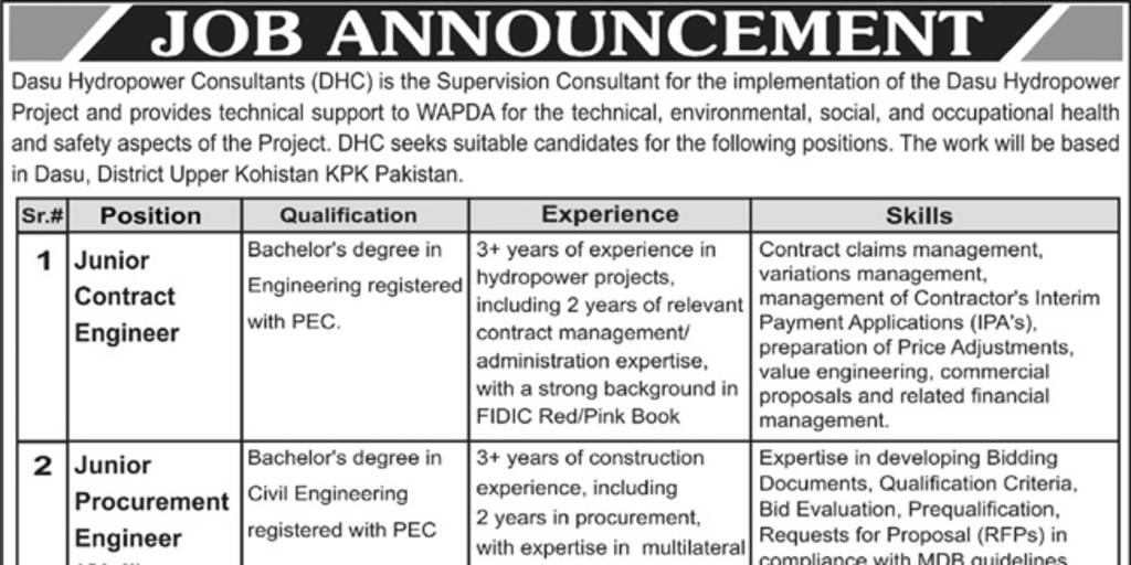 WAPDA Dasu Hydro Power Project Jobs 2024 Advertisement: